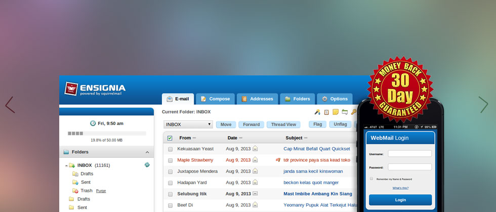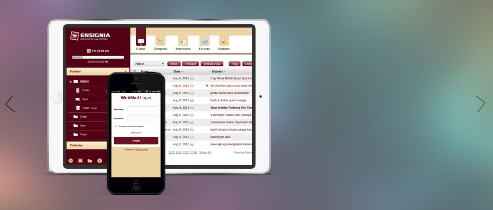 Ensignia is a multilingual webmail suite with features and designs that give a fresh, professional edge to your webmail experience, based on the time tested, popular Squirrelmail platform.